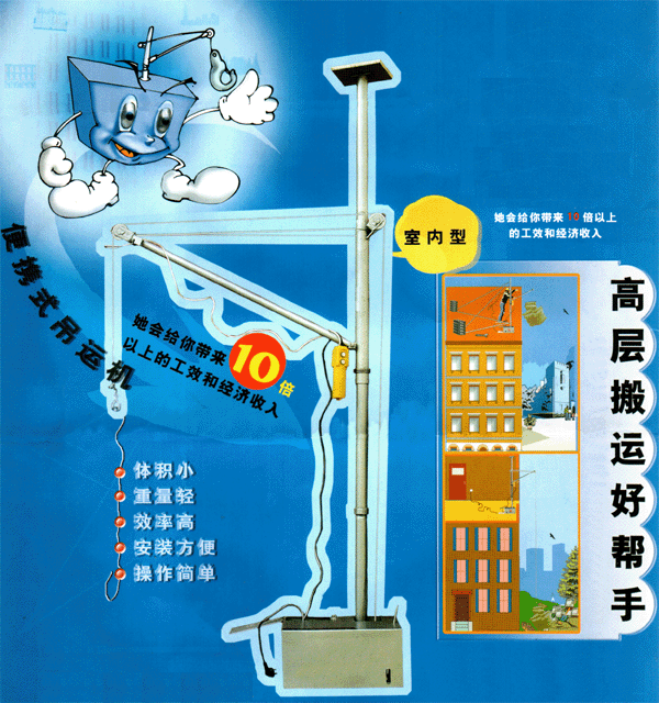 便攜式小吊機是誕生于世紀之初的新產(chǎn)品,它體積小、重量輕,一個人自行車就能攜帶;它吊的高、速度快,30層樓房8分鐘就能打來回;它便于安裝、起重大、容易操作、效率高;它投資小、見效快、零風險、高回報它的問世是當今建筑裝潢行業(yè)機械運料的重大突破,從此將結束高空裝潢材料依靠人工搬運的歷史。它極大地減輕了勞動強度,最大地創(chuàng)造了經(jīng)濟效益。