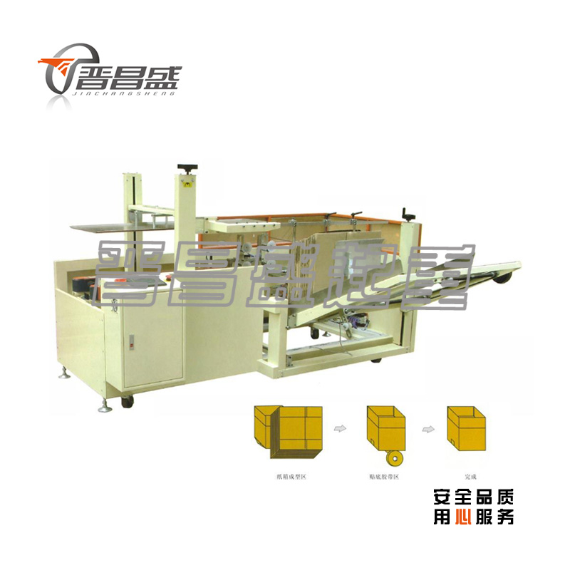 自動完成開箱、成形、下底折葉折曲。并現(xiàn)時完成下部分膠帶粘貼,將疊成紙板的箱板自動打開,箱子底部按一定程序折合,并用膠帶密封后輸送給裝箱機的專用設(shè)備。